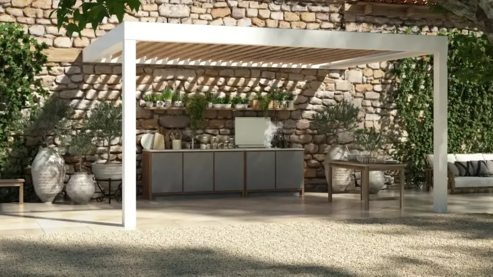 Les matériaux ont été sélectionnés pour affronter les saisons sans broncher. Le plan de travail en Compact Haute Pression teinté dans la masse résiste remarquablement aux intempéries, aux taches et aux UV, tout en conservant son esthétique d'origine. Cela en fait un choix sérieux pour quiconque cherche une cuisine d'été durable et résistante aux intempéries, sans avoir à la remiser à la moindre averse.