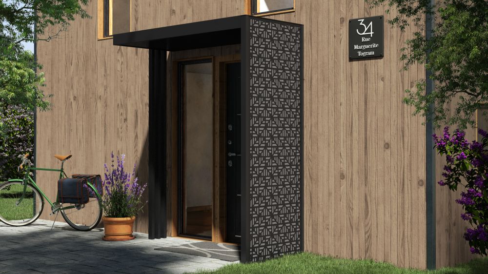 Structurellement, trois poteaux fins portent l'auvent. Leur finesse apporte de la légèreté visuelle alors même que la paroi décorative occupe une belle surface latérale. Les fixations au sol se font via des platines discrètes, ce qui préserve l'effet flottant de l'ensemble. Cette combinaison compose un auvent de porte d'entrée moderne et épuré qui ne sacrifie jamais l'esthétique à la technique.